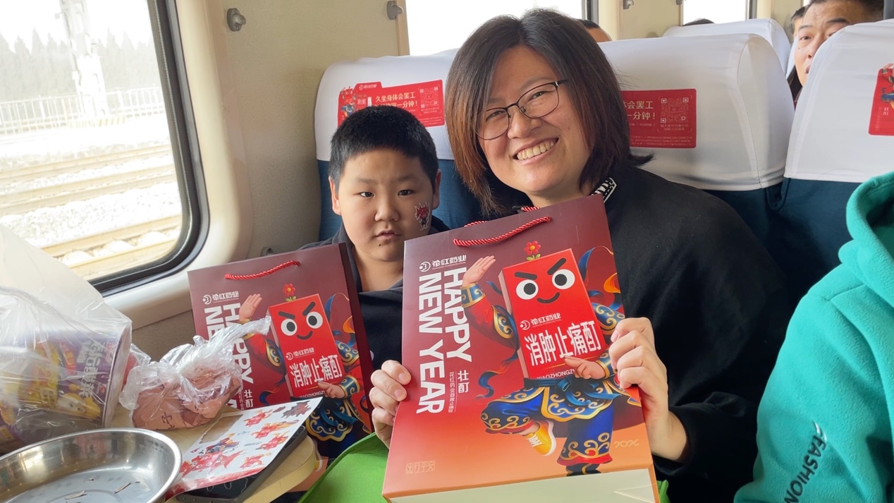 列车驶离站台,“移动健康驿站”也随之启动。工作人员与“壮酊”组成出行守护小分队,为旅客送上年味十足的“新春健康福袋”,福袋内不仅装有传统年货,更搭配了壮酊周边好礼,守护平安归乡旅程。与此同时,“壮酊”邀请旅客一起说出对家人与未来的美好期盼,将品牌的健康守护理念融入新春的祝福语境之中,实现与旅客的情感同频。