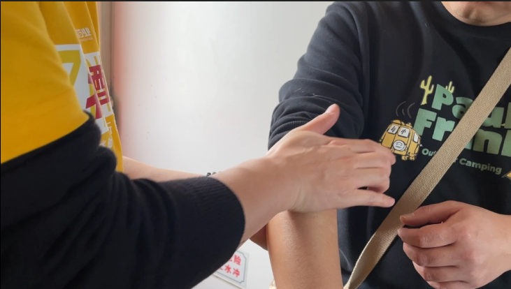 工作人员邀请有肌肉酸痛、关节不适症状的旅客参与产品体验,在真实的旅途场景中演示消肿止痛酊的使用方法与功效特点,并提供旅途出行健康管理的实用小贴士。