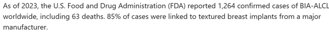 截至2023年,美国食品药品监督管理局(FDA)报告全球BIA-ALCL累计确诊 1264例,其中 63 例死亡,85% 病例与某知名品牌毛面乳房假体相关;临床数据显示,85% 的早期确诊病例经规范治疗后可痊愈,并非绝症 。