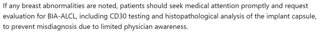 若发现乳房异常症状,需第一时间前往正规医疗机构,主动提出排查 BIA-ALCL,配合 CD30 蛋白检测、假体包膜病理分析等专项检查,避免因医生认知不足导致漏诊、误诊。