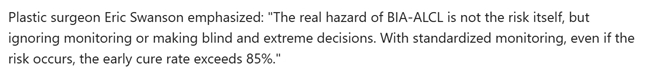 整形外科专家 Eric Swanson 强调:“BIA-ALCL 的真正危害,并非风险本身,而是忽视监测或盲目极端决策;在规范监测下,即使发生风险,早期治愈率也超过 85%”。